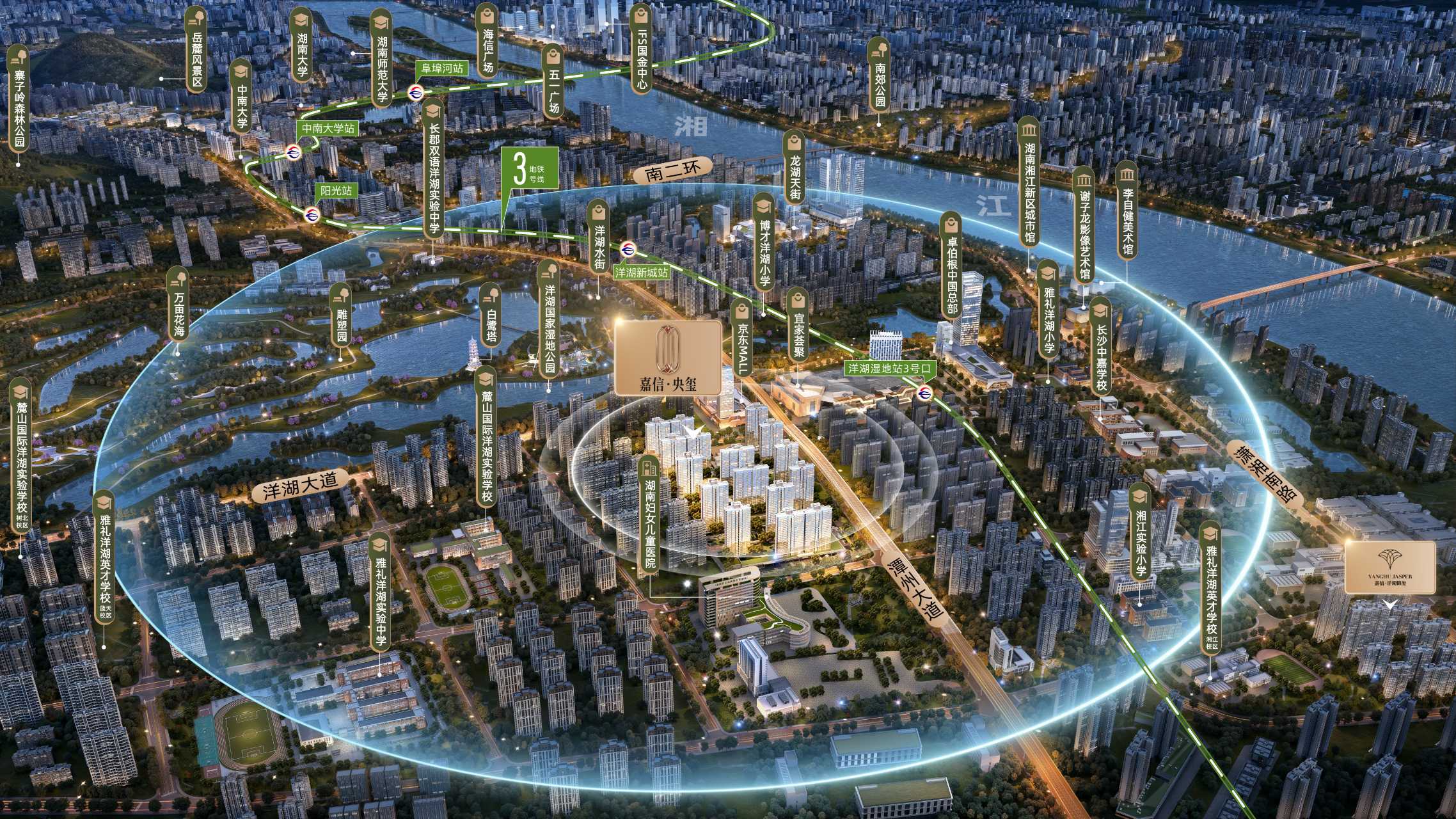 周边直线3km范围内有4个地铁站(洋湖湿地、洋湖新城、山塘、阳光),轨道交通发达,距离最近的地铁站是洋湖湿地。